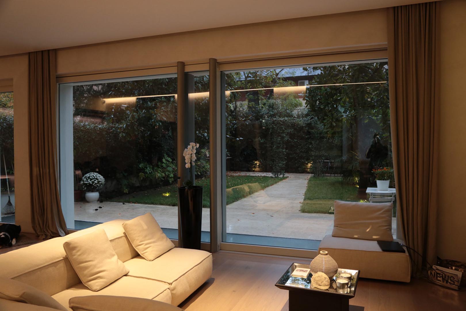 The light gives the stone and finish an extraordinary effect, which is enhanced by the wooden components and the modern furniture.