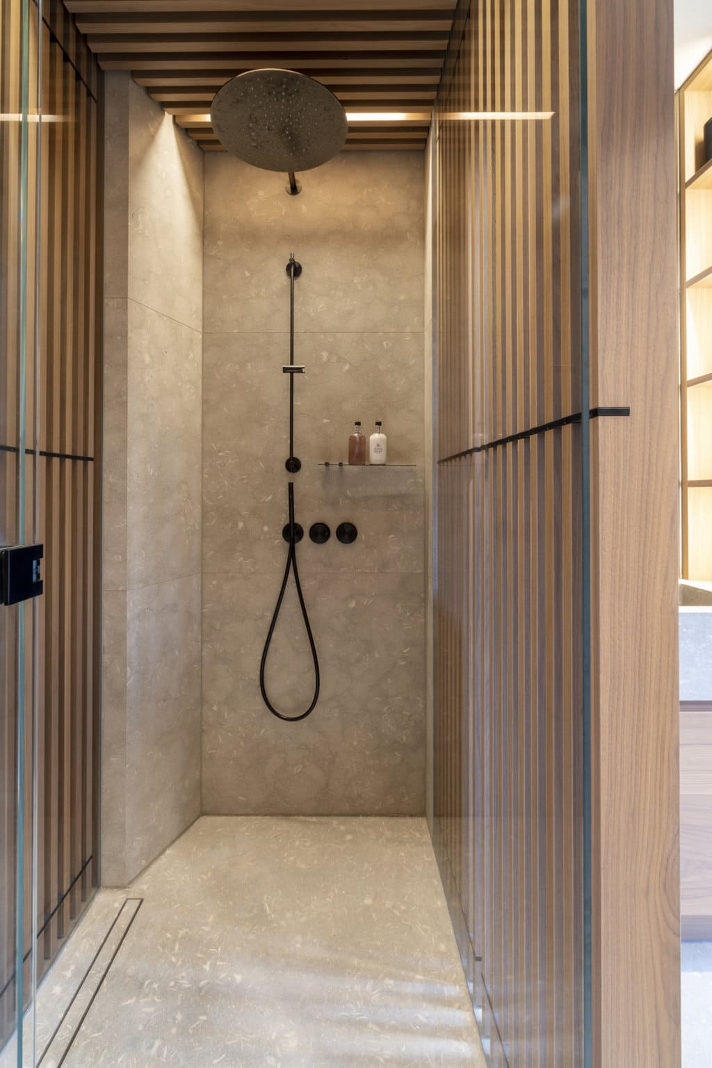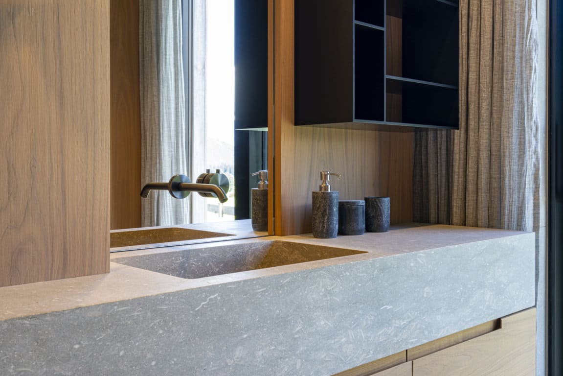 Nous trouvons des finitions de haut niveau qui mettent en valeur l’harmonie de la pierre naturelle, du béton, du noyer, du verre et du métal.