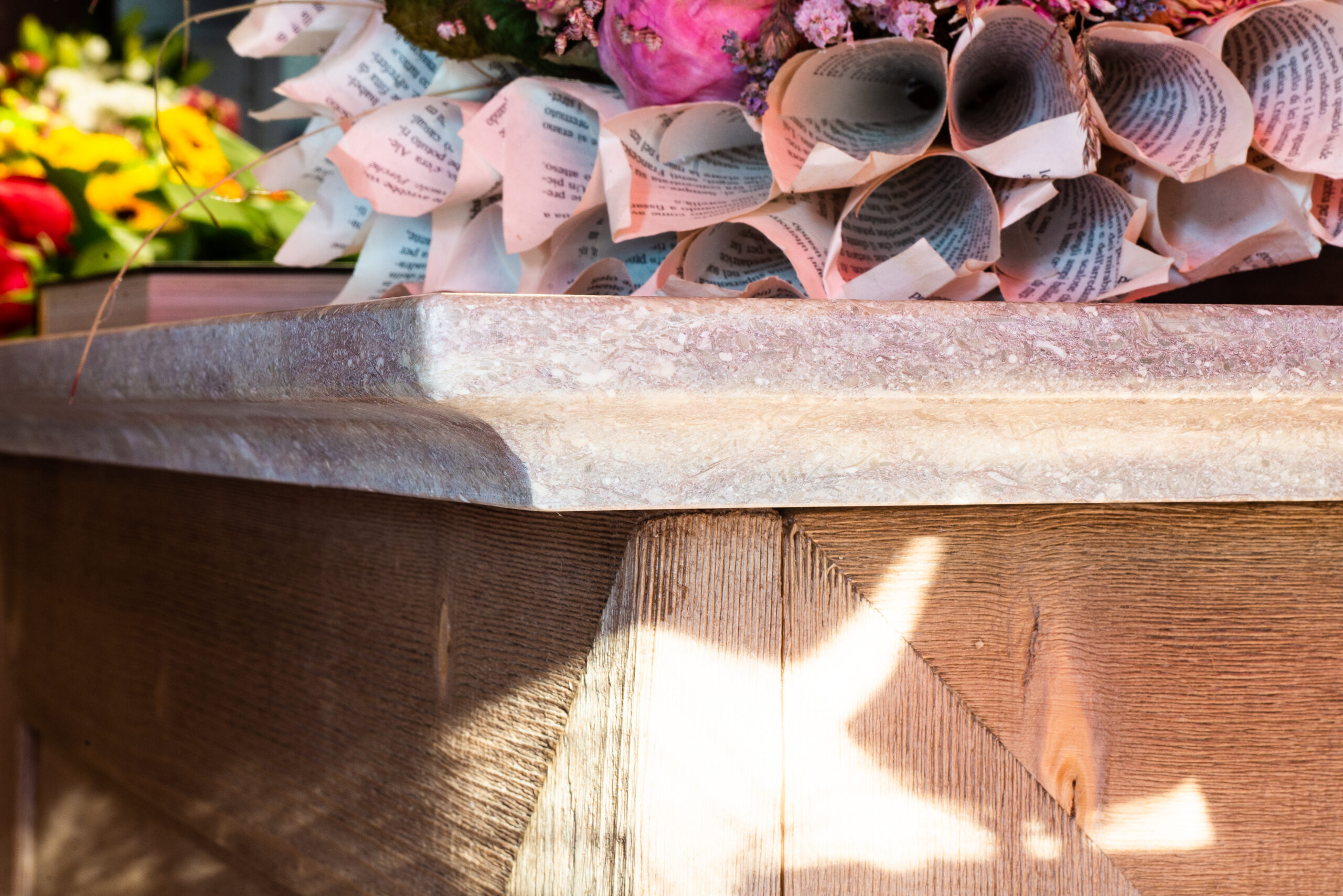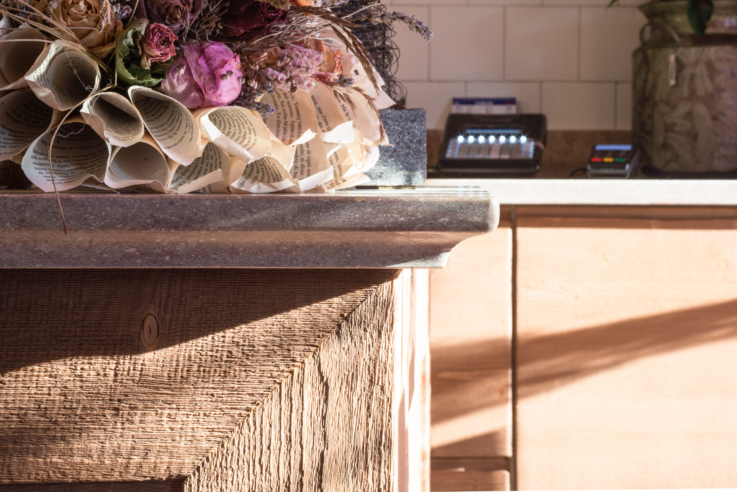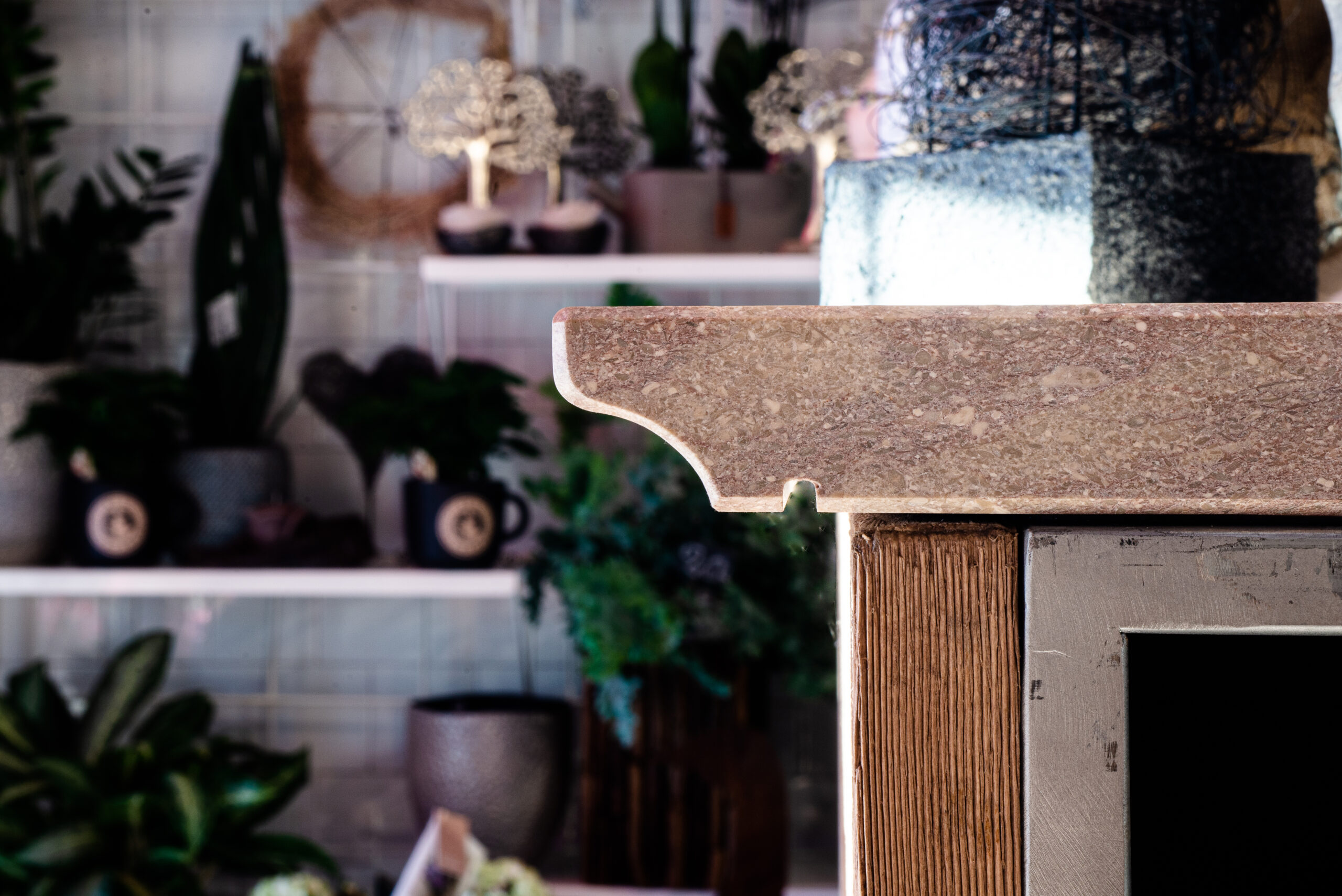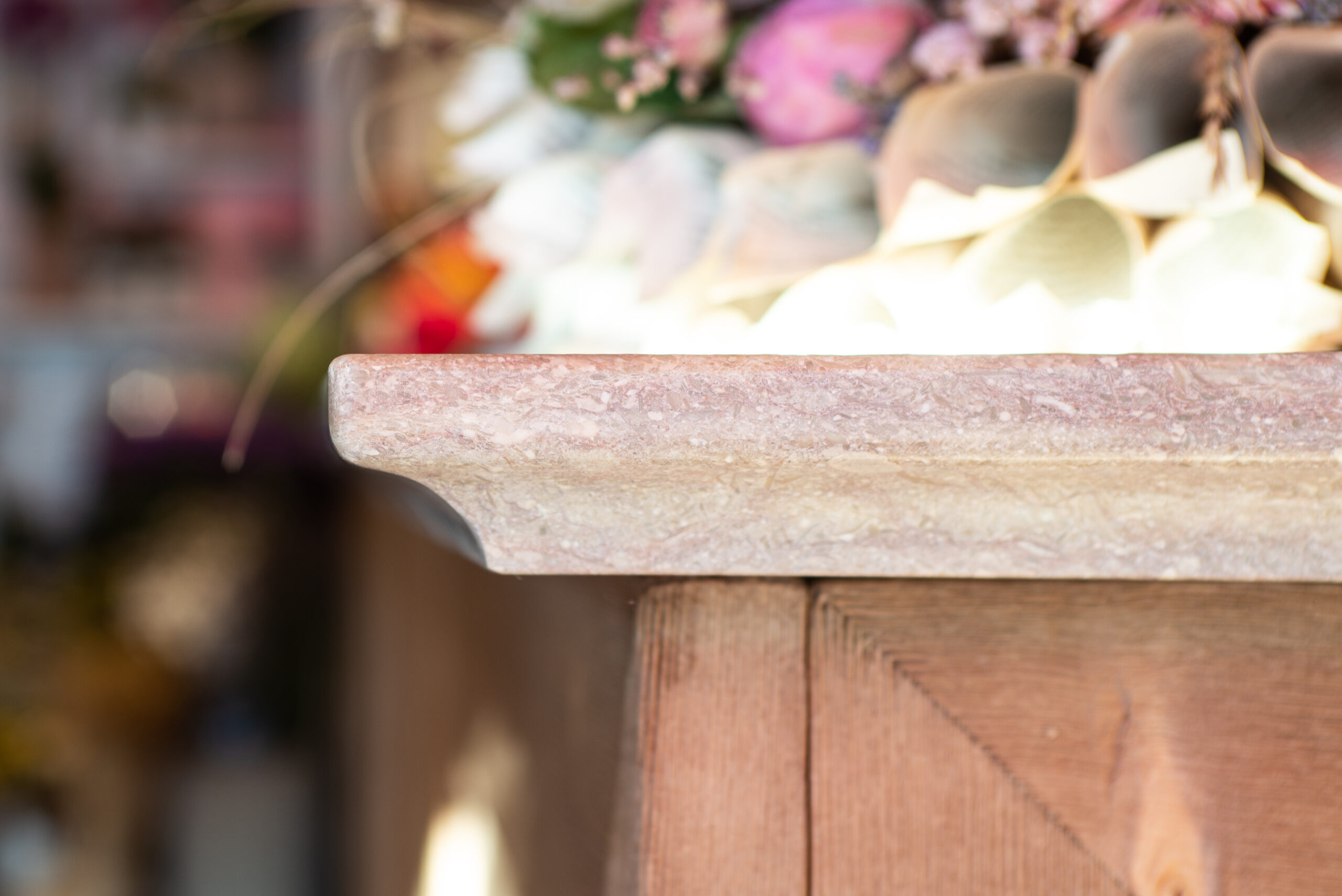 Per la realizzazione di questo negozio di fiori a Vicenza, abbiamo collaborato con Loreni Studio. Ci siamo occupati della creazione di questo bellissimo bancone con il nostro marmo Grolla. Da notare la lavorazione dei bordi.