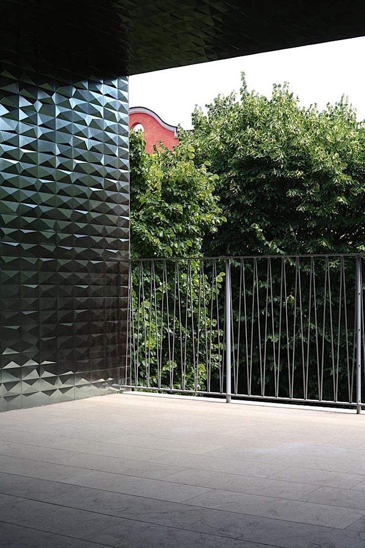 Ecco che la pavimentazione esterna si abbina perfettamente con le facciate del complesso abitativo, le quali sono straordinariamente bilanciate attraverso un variegato pattern di cromie e finiture. Le ceramiche diamantate scure mettono in risalto il colore chiaro del marmo Grolla, così come il verde della vegetazione.