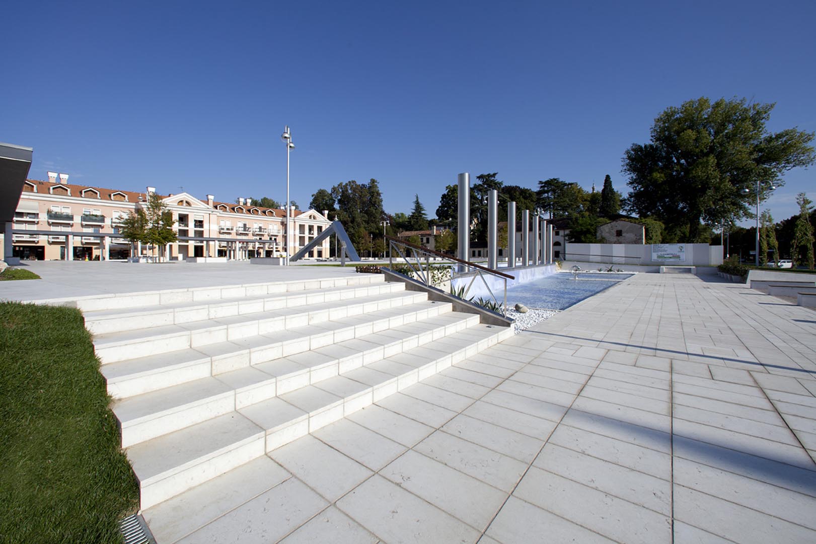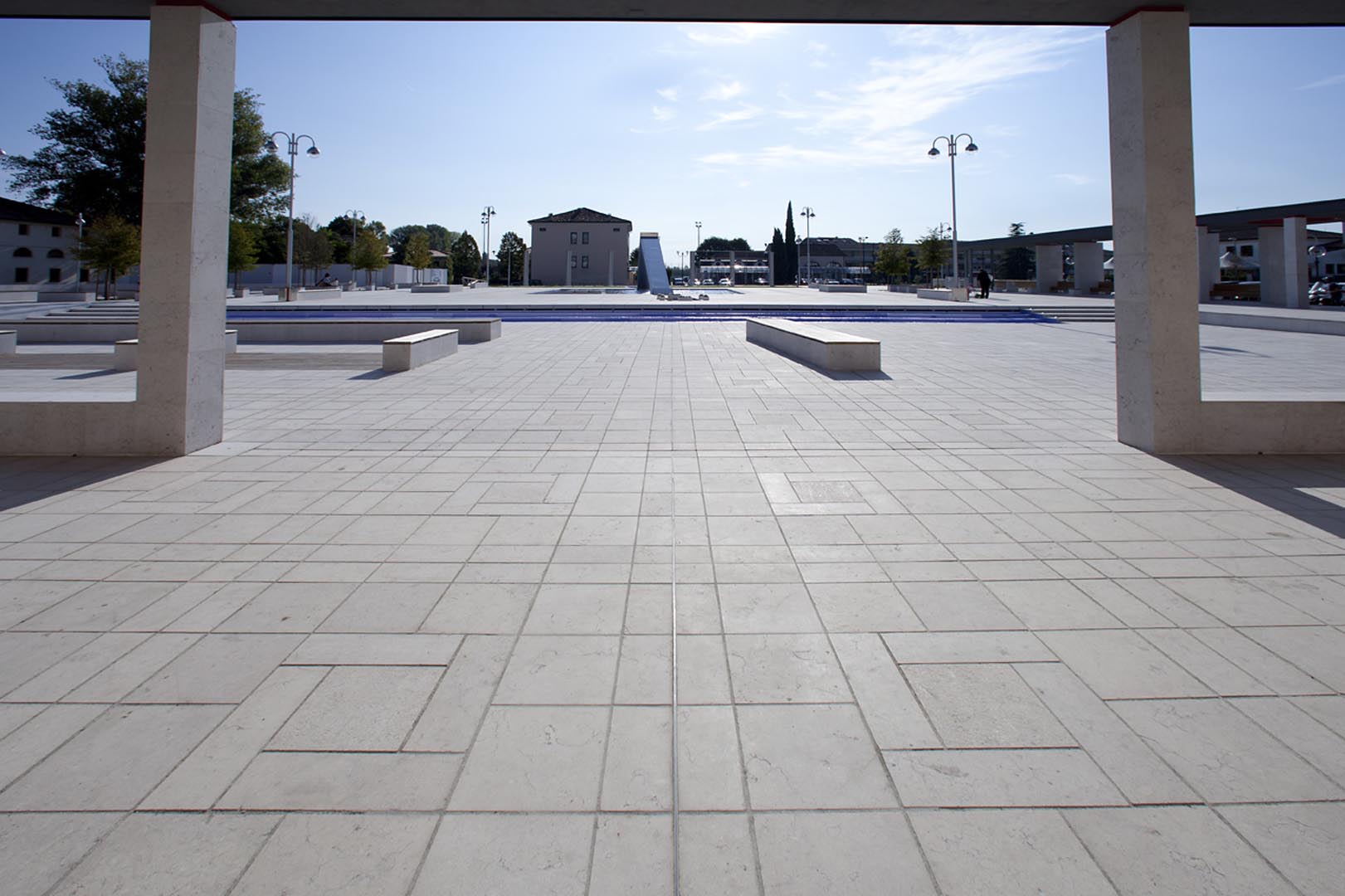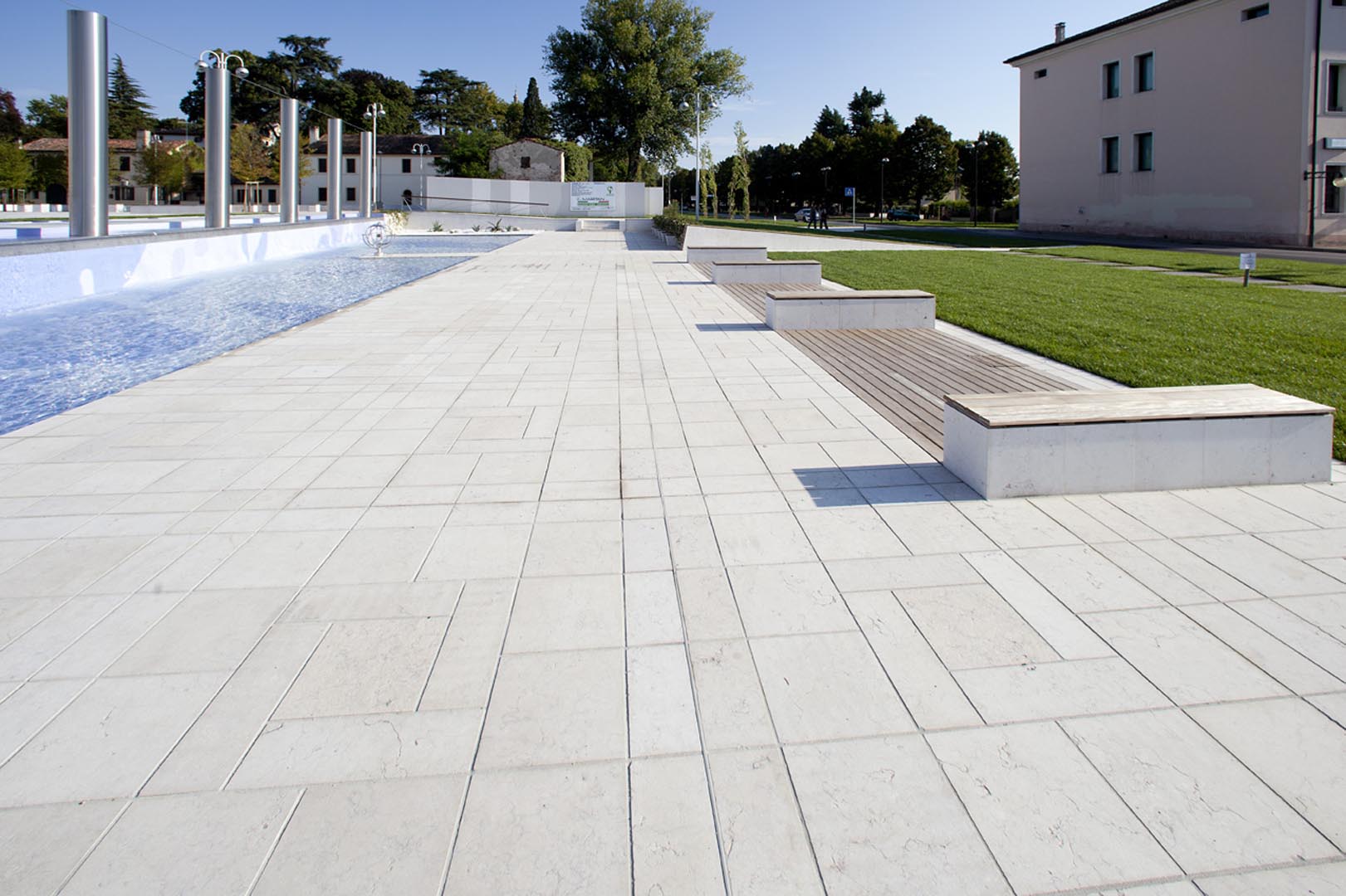 La pavimentazione e i gradini di Piazza Europa, a Noventa Padovana, sono stati realizzati in formato opus romano con il nostro Grolla Beige sabbiato. Il rivestimento dei pilastri è a casellario. Lo stesso marmo, abbinato a elementi in legno, è stato utilizzato anche per i diversi oggetti di arredo urbano.