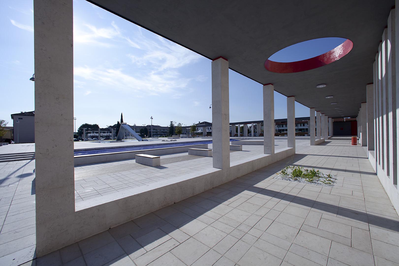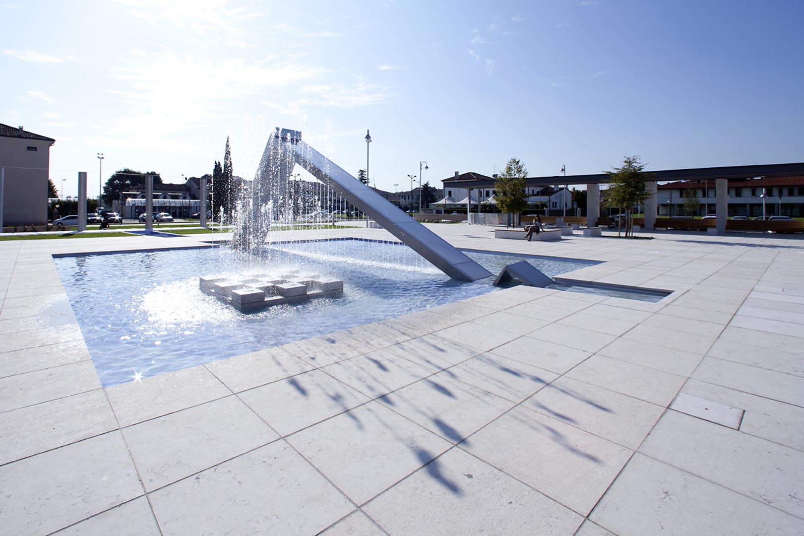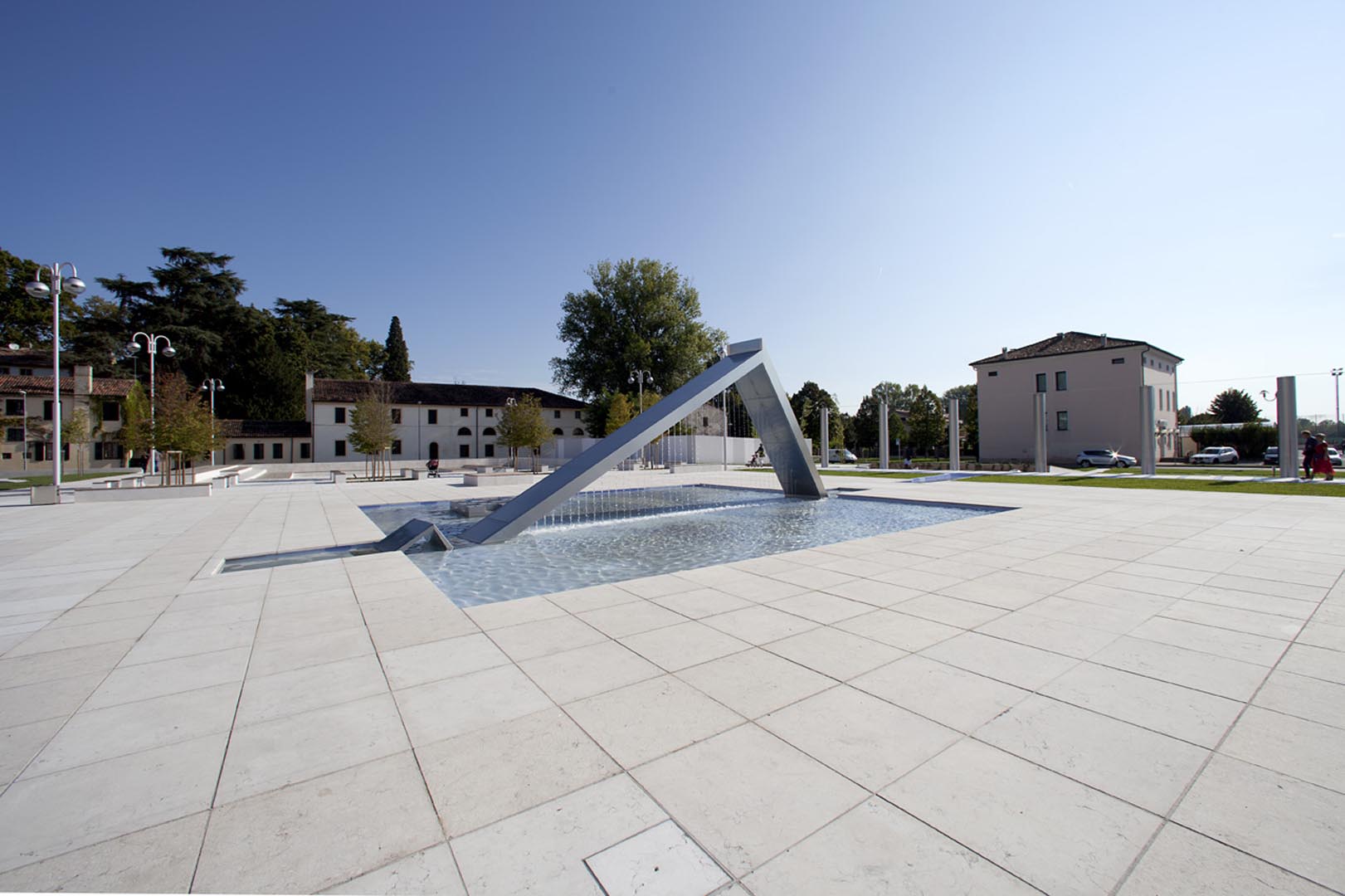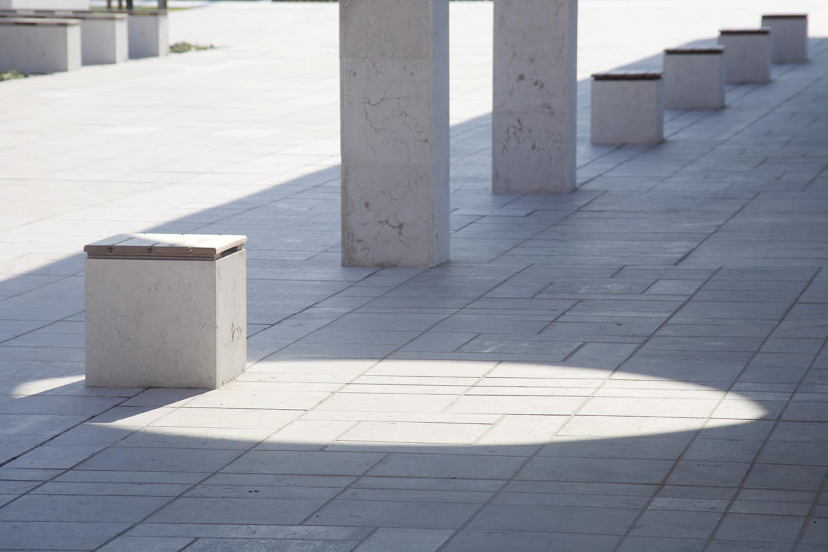 La pavimentazione e i gradini di Piazza Europa, a Noventa Padovana, sono stati realizzati in formato opus romano con il nostro Grolla Beige sabbiato. Il rivestimento dei pilastri è a casellario. Lo stesso marmo, abbinato a elementi in legno, è stato utilizzato anche per i diversi oggetti di arredo urbano.