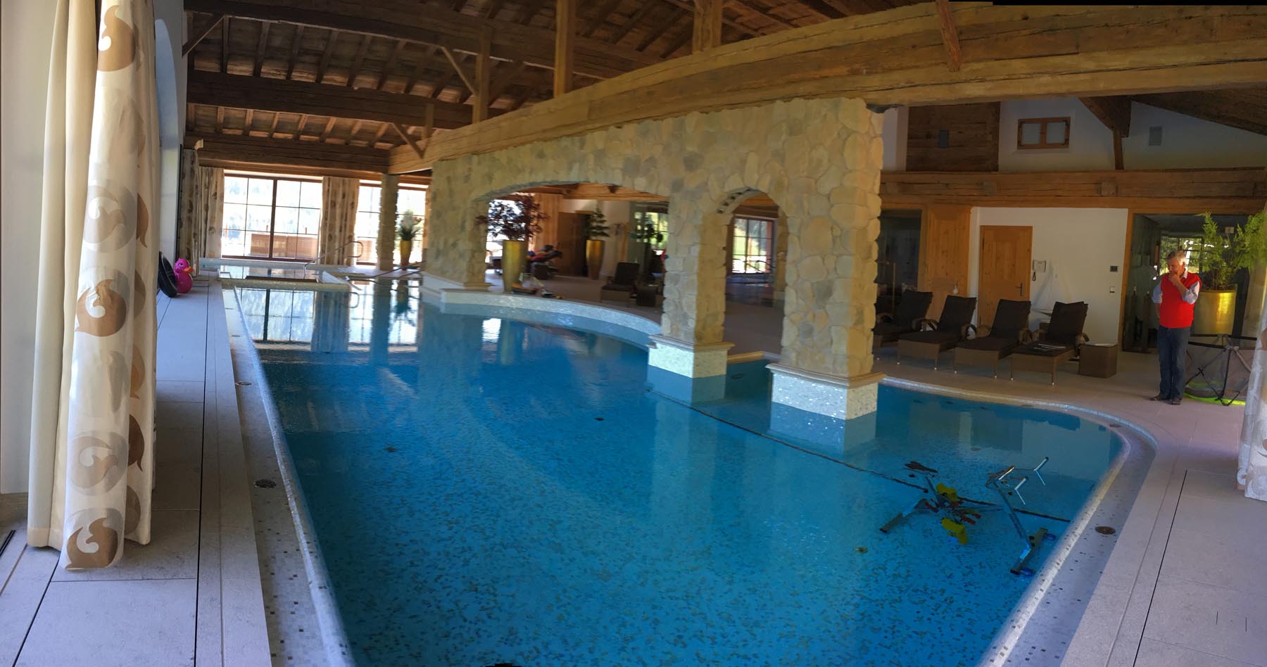 Per una piscina privata in Germania abbiamo fornito il nostro Grolla Beige ondulato con cui sono stati rivestiti la pavimentazione, le copertine, il battiscopa e il piatto doccia. Particolare di notevole eleganza ed esclusività è il rivestimento della parete e del piatto doccia in mosaico.