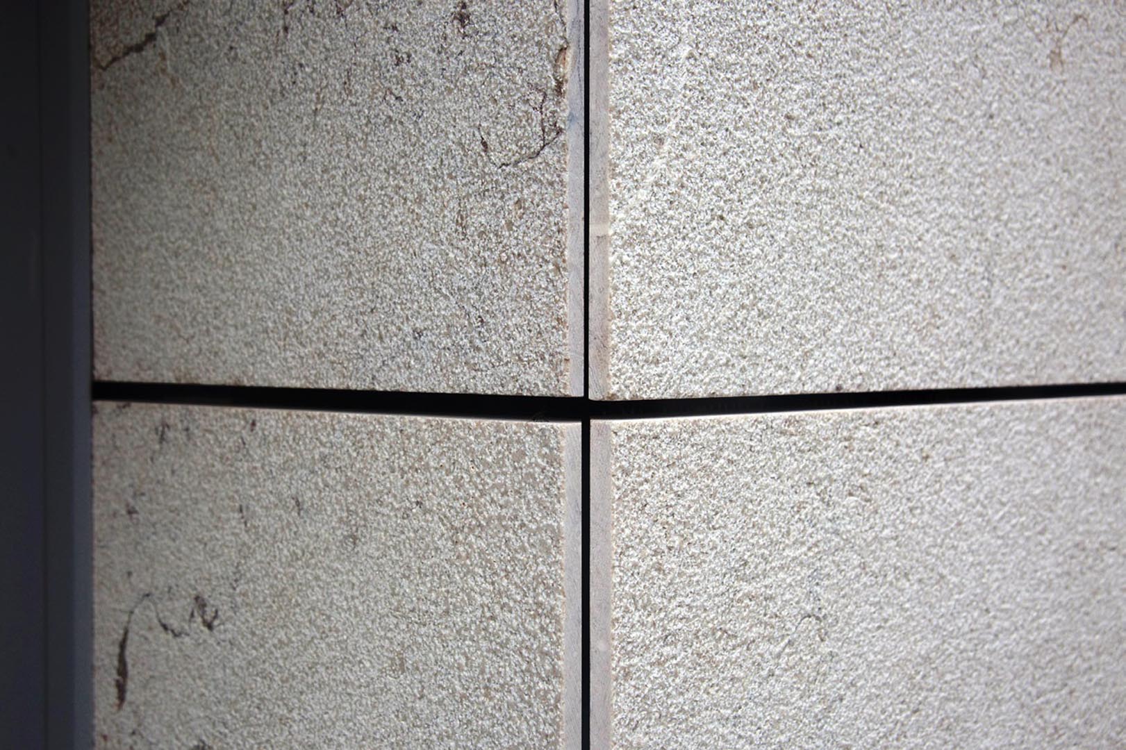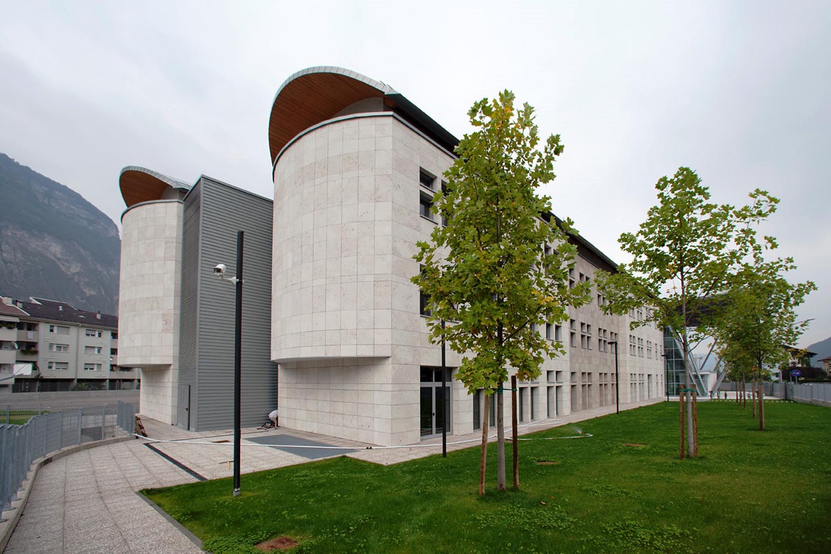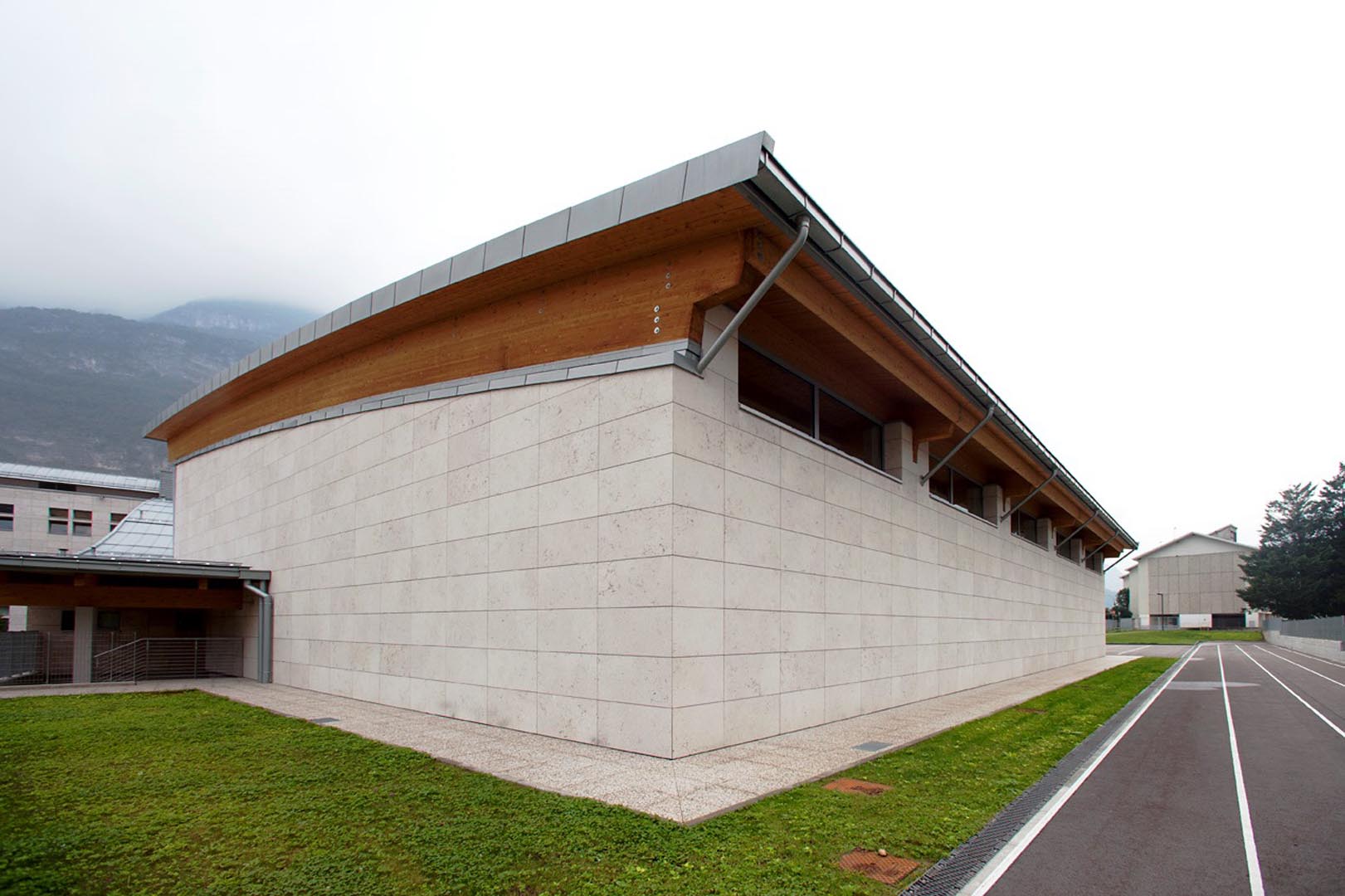 Per il polo scolastico di Mezzo Lombardo è stato realizzato un rivestimento ventilato delle pareti esterne in marmo Grolla Rosato, con due diverse finiture: la bocciardatura e la fiammatura. Mentre la prima conferisce al marmo una superficie ruvida che mette in evidenza le venature della pietra (matericità), la seconda offre al tatto una sensazione molto più liscia e opaca.