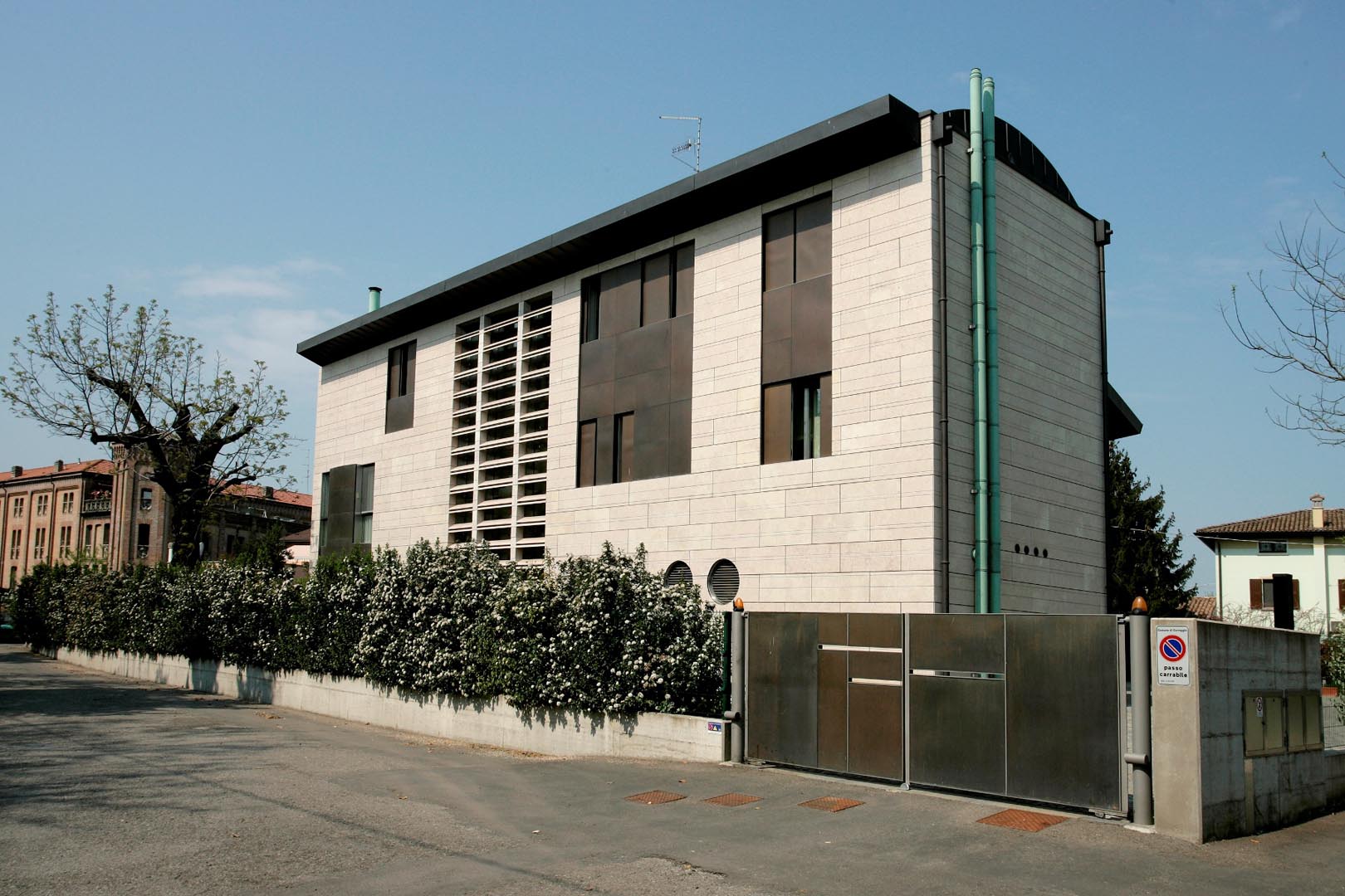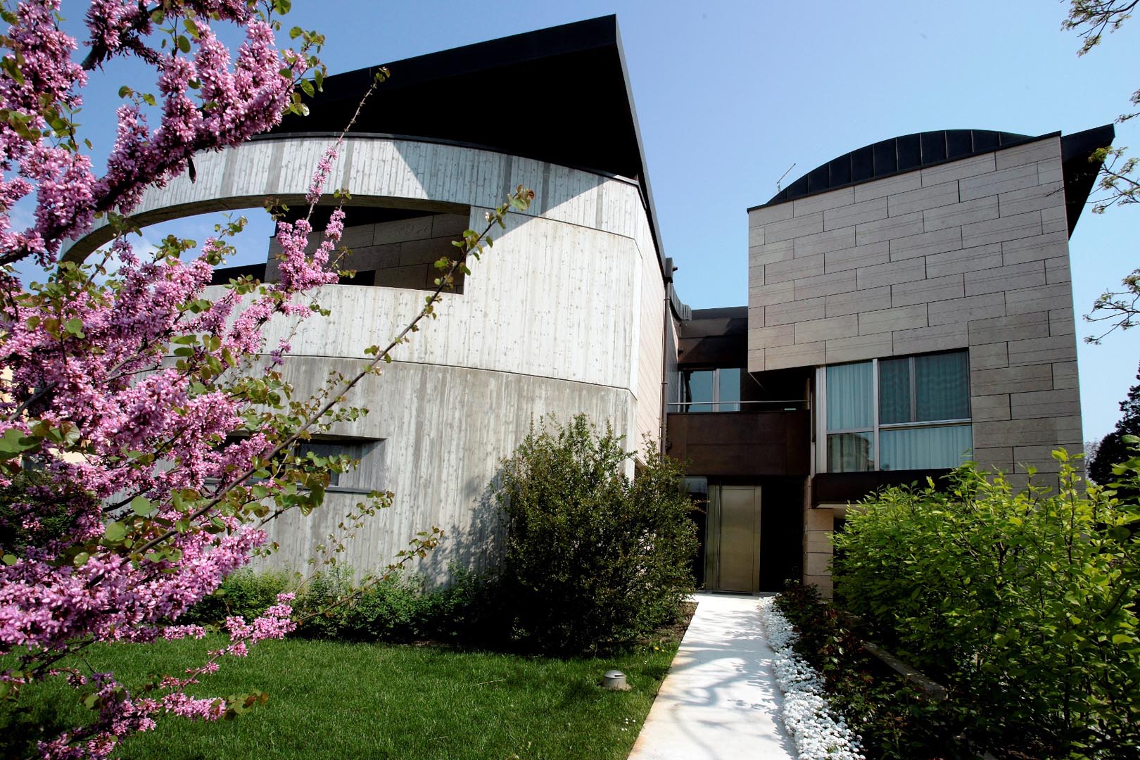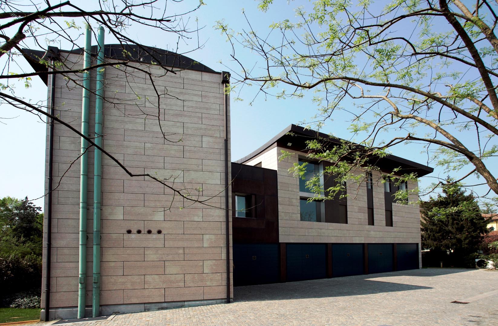In Italia, in un tessuto periferico disordinato ed eclettico, questo progetto ha previsto l’inserimento di un edificio contemporaneo: una villa privata, realizzata con materiali nuovi e performanti. Ampie vetrate collegano gli spazi interni con quelli esterni e per le facciate, ventilate con formati a casellario, è stato scelto il Grolla Rosato spazzolato, lavorato con “falsa fuga” per soddisfare le esigenze estetiche stabilite dal progettista.